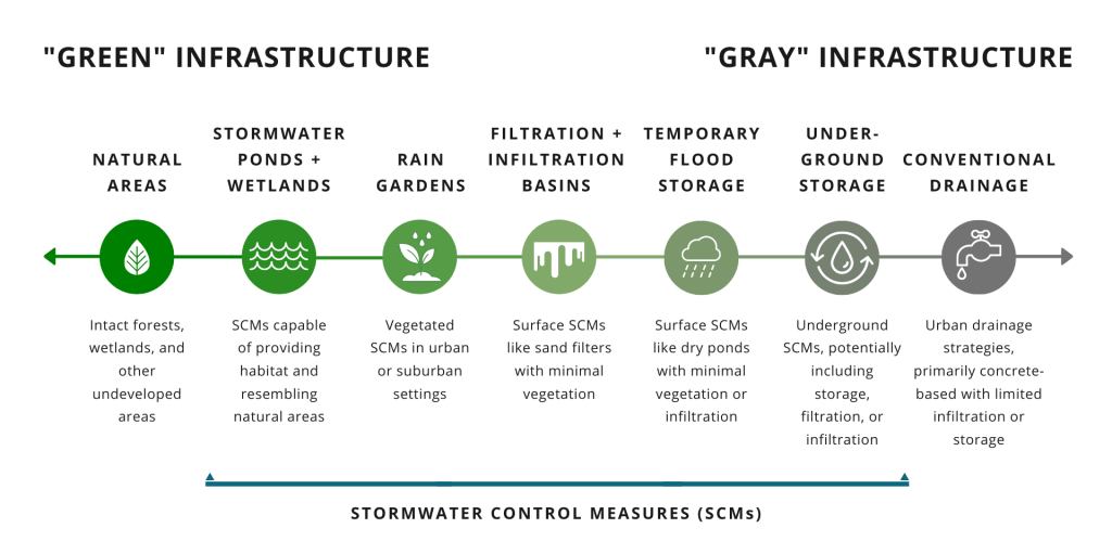 According to the American Society of Civil Engineers (ASCE), the duty of all engineers is to “first and foremost, protect the health, safety, and welfare of the public” [3]. But how does such an abstract promise to protect the public translate to my work in stormwater management? Since the Clean Water Act of 1977 and the Water Quality Act of 1987, civil engineers have developed many strategies to protect streams and rivers from urban pollution in stormwater runoff. More recently, nature-based solutions called green infrastructure (Figure 1) have been gaining popularity. Rain gardens (Figure 2a) and other green infrastructure practices (Figure 2b) are beautiful, they’re exciting, they’re a step toward the cities of the future, and they’re crucial for cities to be resilient in the face of climate change. But beneath the beauty and seemingly objective altruism surrounding green infrastructure implementations lies a precarious web of interactions, co-dependencies, and potential unintended consequences that have significant environmental and social impacts.
